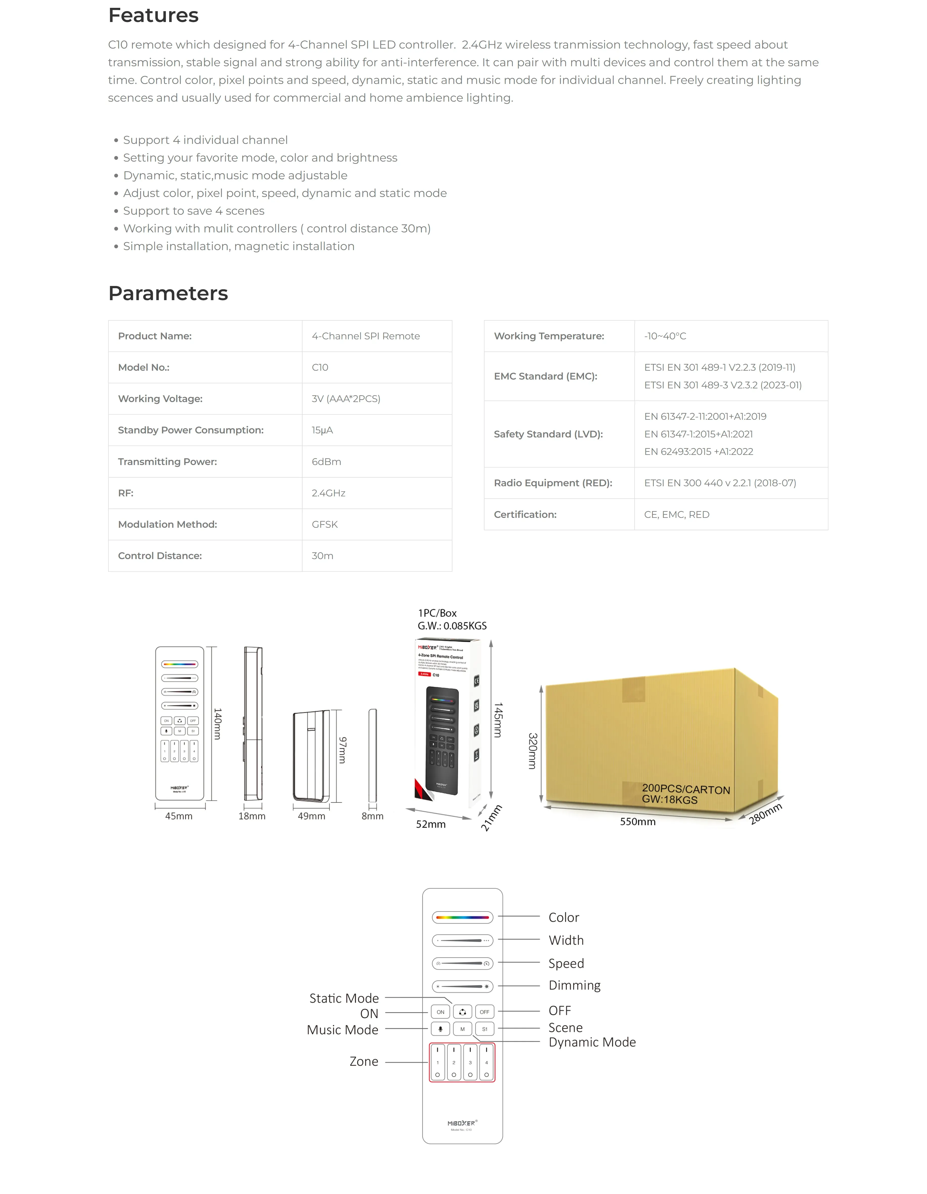 The C10 remote for SPI controllers is an advanced device that allows precise control over SPI LED-strips. It supports 4 independent zones, allowing control of different lighting areas from a single remote. Users can adjust the color and brightness of the strip, create and save scene settings. The device uses 2.4GHz wireless technology, ensuring a stable signal and high anti-interference capability. The C10 remote is compatible with the MiBoxer/Mi-Light 2.4G series and offers a control range of up to 30m. With easy installation and magnetic holder, it is convenient to use. Powered by 2xAAA batteries.