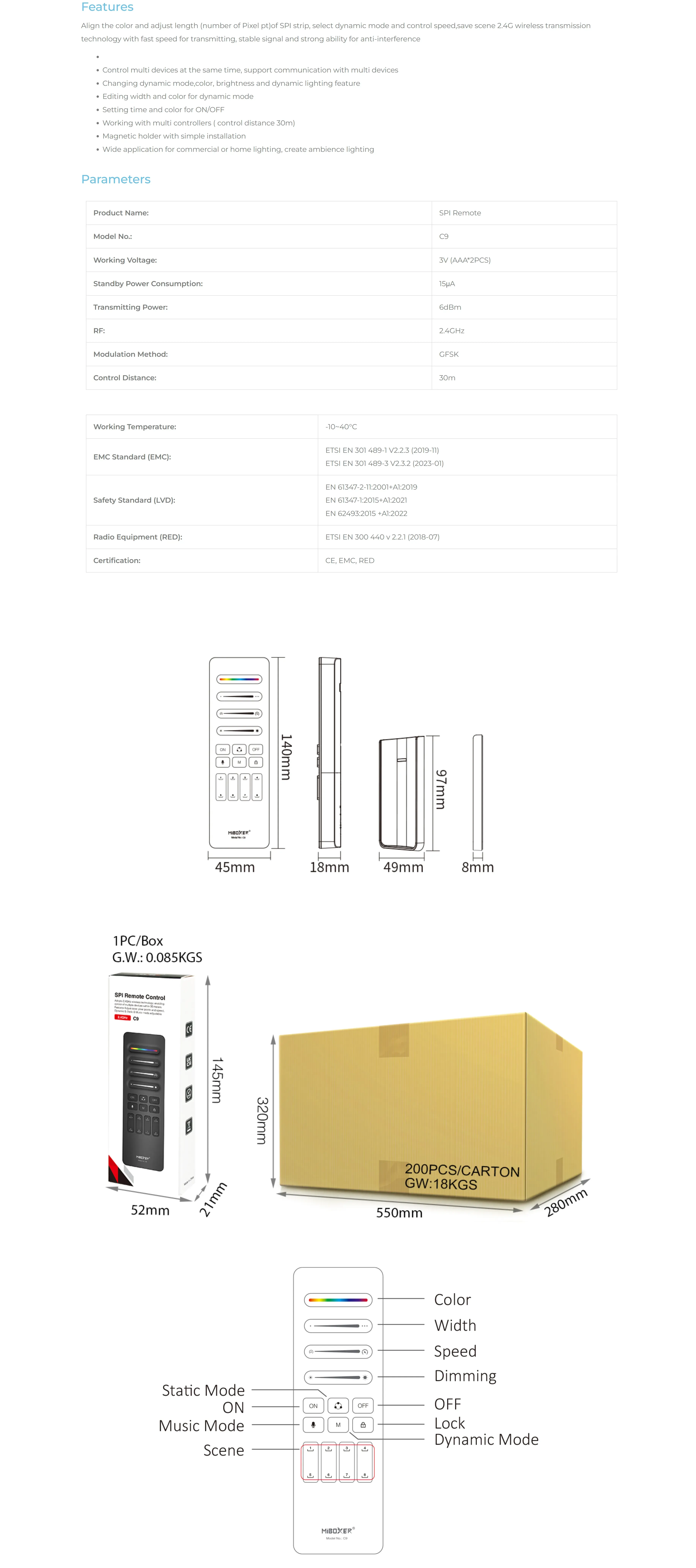 The C9 remote for SPI controllers is an advanced device that allows precise control over SPI LED-strips. It supports 8 programmable lighting scenes that can be easily selected via dedicated buttons. Users can adjust the color and brightness of the strip, create and save scene settings. The device uses 2.4GHz wireless technology, ensuring a stable signal and high anti-interference capability. The C9 remote is compatible with the MiBoxer/Mi-Light 2.4G series and offers a control range of up to 30m. With easy installation and magnetic holder, it is convenient to use. Powered by 2xAAA batteries.