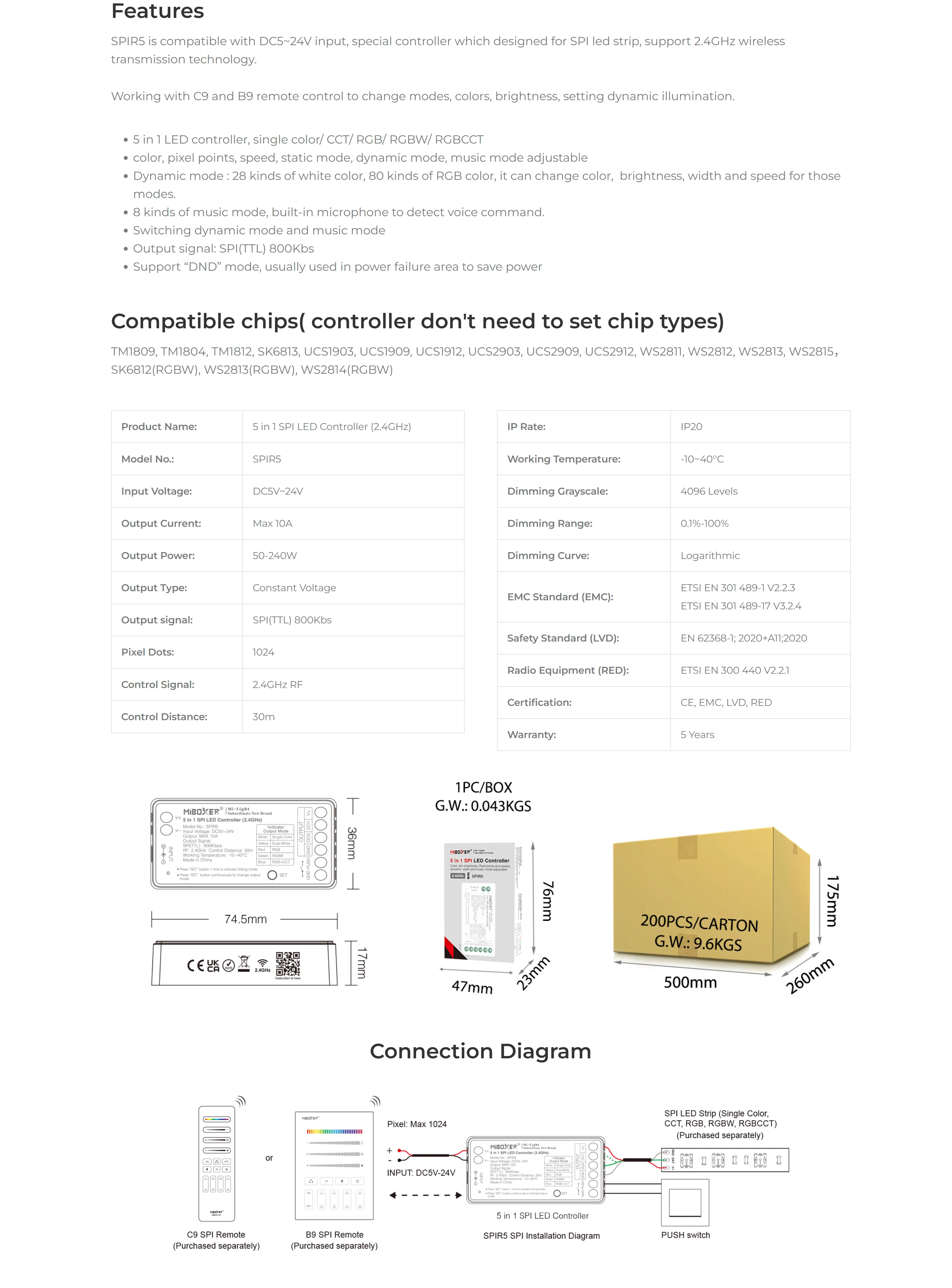 SPIR5 je napreden krmilnik za naslovljive SPI LED trakove. Podpira pet načinov: enobarvni (DIM), CCT, RGB, RGBW in RGB+CCT ter je združljiv s priljubljenimi čipi (WS2811, WS2812, TM1914, SK6812 itd.). Upravljanje z daljinci MiBoxer/Mi-Light 2.4GHz (domet do 30 m). Ponuja 80+ dinamičnih RGB učinkov, 28 belih načinov in 8 glasbenih načinov z vgrajenim mikrofonom. Omogoča gladko nastavitev barve, svetlosti, hitrosti učinkov in števila slikovnih pik; do 1024 slikovnih pik v načinu SPI. Za več udobja in varnosti sta na voljo zagonska animacija in način DND. Napajanje: DC 5–24V.